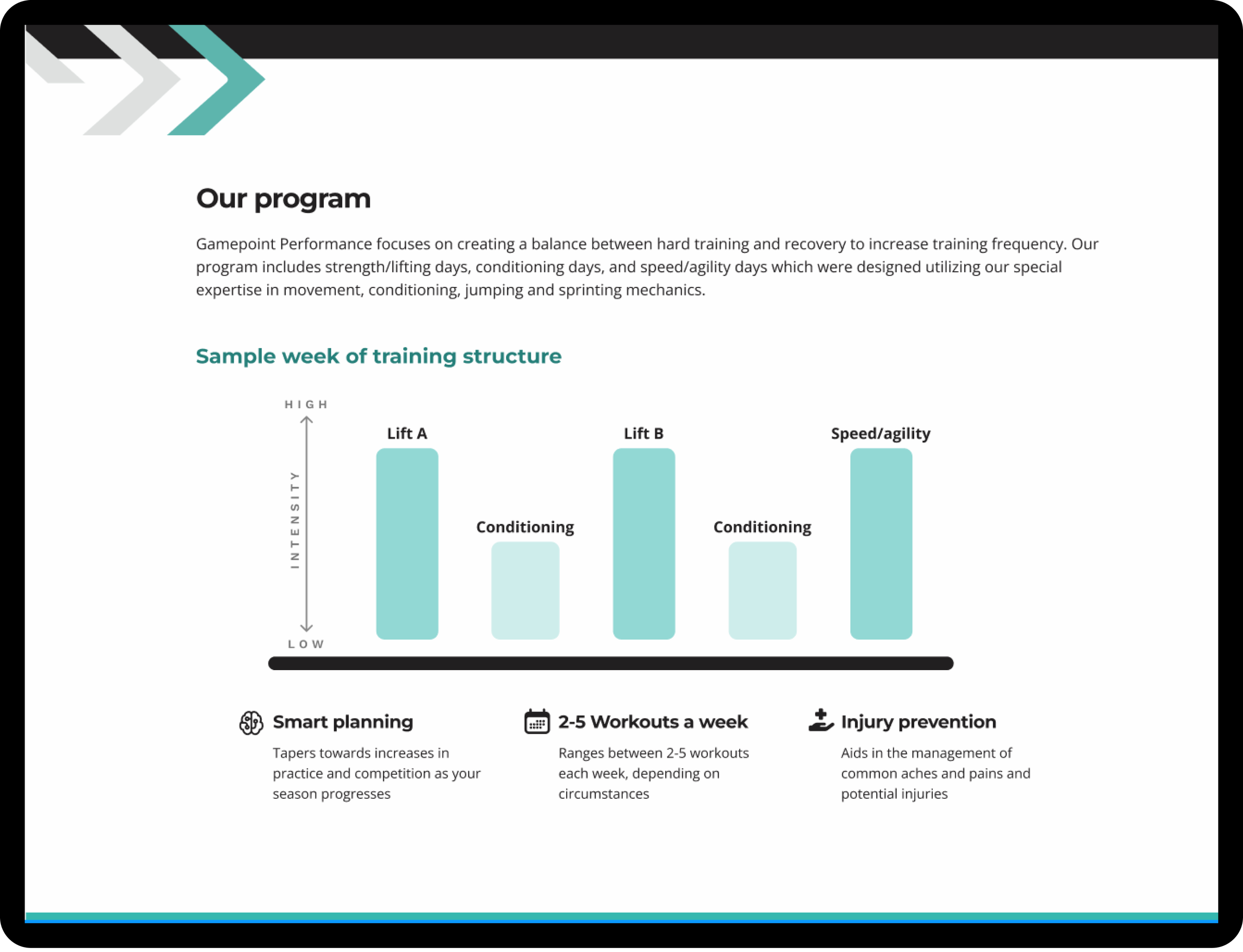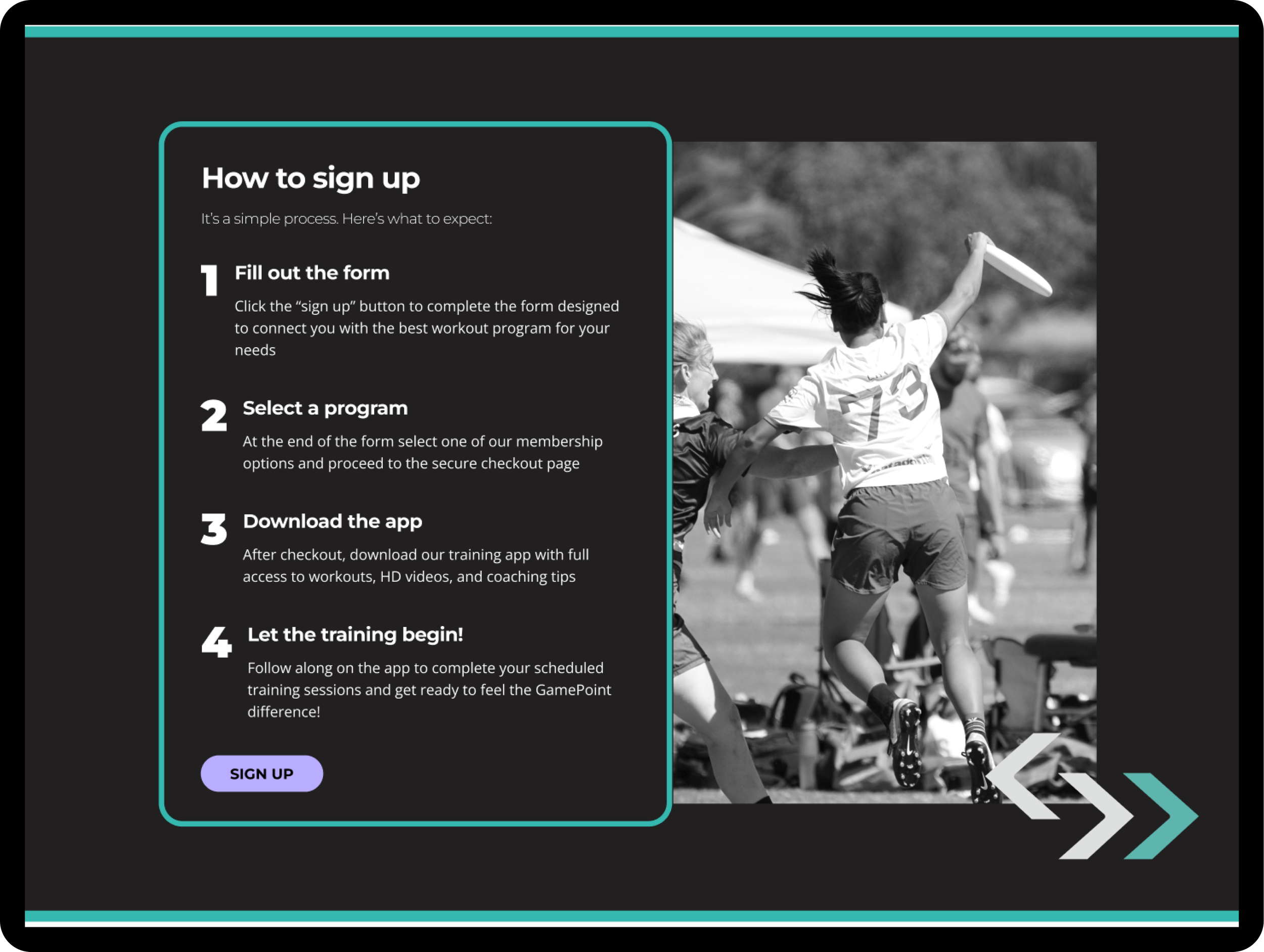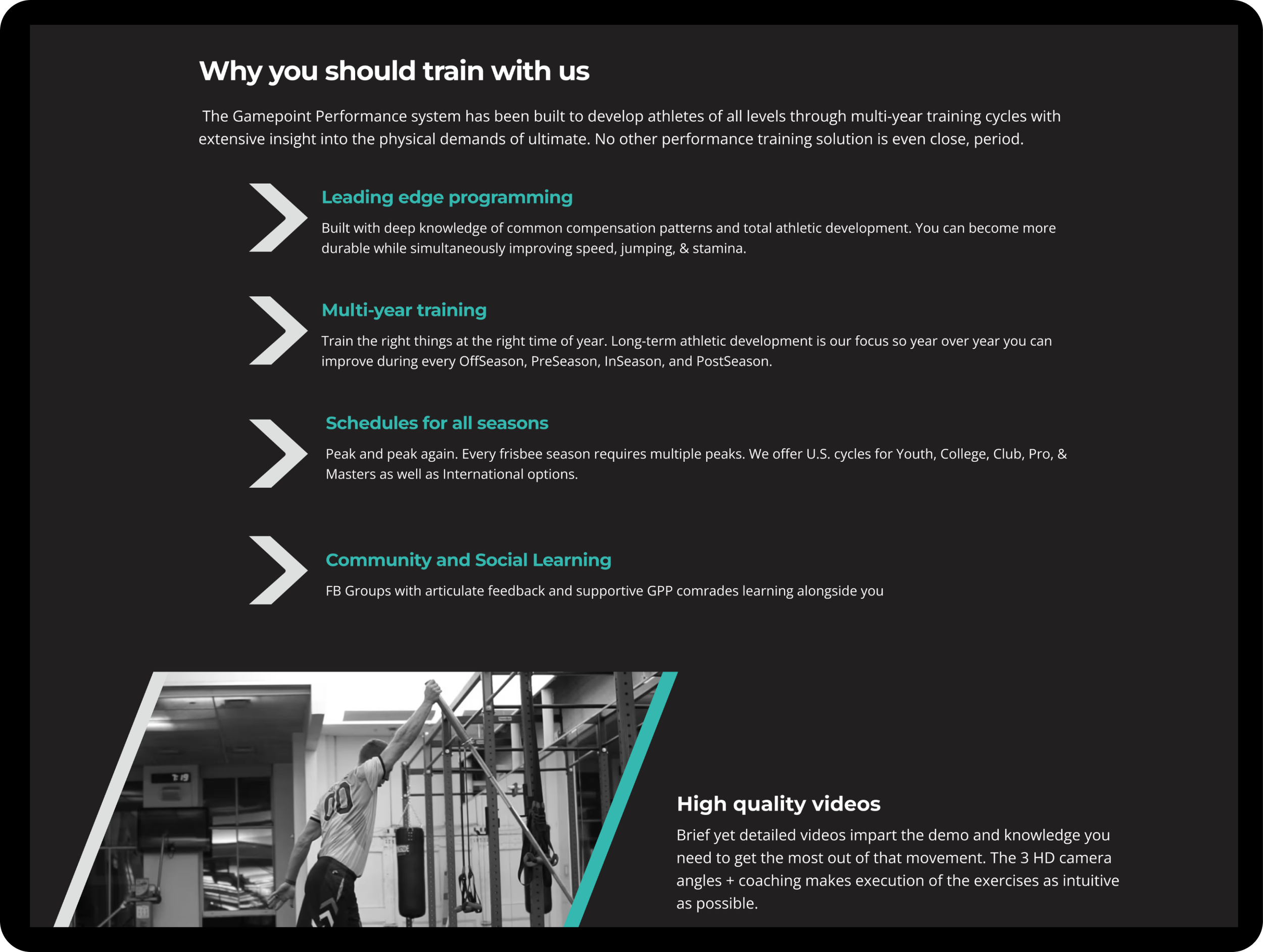 Client: Gamepoint Performance is a fitness training program designed for ultimate frisbee athletes. Overall they wanted a redesign of their current website, with a focus on improving the number of sign-ups. They also wanted to improve the automation of the sign-up system.